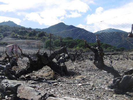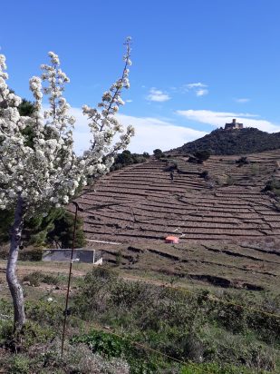 Pour pique-niquer, changement de décor : le Fort Saint Elme perché sur une colline à 160 m d’altitude, accessible en voiture.Très jolie balade dans les vignes de Banyuls sur des terrasses petites et très soignée. La route très étroite, est à sens unique, mais nous ne le savions pas. Un peu d’excitation, et si quelqu’un venait en sens inverse ? Nous nous arrêtons pour des photos, avec les ceps en premier plan, avec un arbre tout blanc (peut être un poirier ?) des genêts jaunes…La route décrit une grande boucle passe devant un autre fort : le fort Dugommier moins imposant que le Fort Saint Elme.