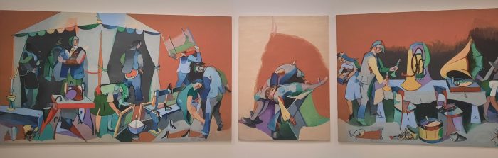 De nouvelles teintes font irruption, des scènes pleines d’humour se déclinent en couleurs vives. Des chevalets sont déménagés à dos de personnages dansants….