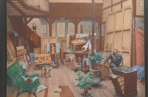 L’immense Triptyque du Dragon résume l’ensemble de son œuvre : au centre dans l’atelier du peintre, se trouve en bonne place L’équilibre(1933), un homme au chapeau à la joue rouge(1943) , dans la vitrine, un mannequin masculin rappelle toute les mannequinades récurrentes dans l’après-guerre, on reconnait aussi son cycliste. A gauche, c’est une scène de café.