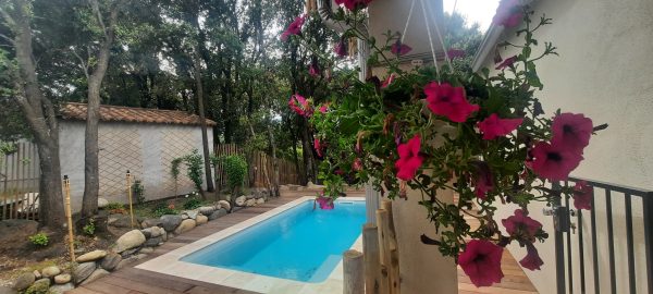 Notre nouveau gîte (affilié aux Gîtes de France) fait partie d’un ensemble de cinq maisons. Chacune a une terrasse avec une belle table à l’ombre d’un auvent et une petite piscine bleue isolée par des ganivelles avec un salon de jardin confortable : canapé et fauteuils rembourrés. Un gros buisson de bougainvillées, une suspension de surfinias assorti égaient l’ensemble. Derrière un petit muret en galets : des buissons, hortensias, géraniums. Les arbres : chênes et arbousiers ont été élagués pour dégager la piscine.