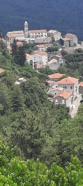 Au creux d’un vallon nous croisons le GR Mare e Monti puis découvrons perché sur un épaulement, le village de Poggio-di-Nazza : toit de tuiles rouges et campanile très haut. Cela commençait bien par un P !