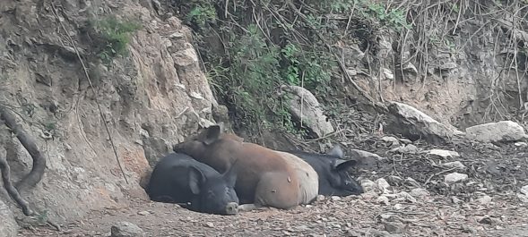 A la sortie d’Isolaccio, encore des panneaux caviardés. L’étape suivante du circuit serait Prunelli-di-Fiumorbo. Un P est vaguement identifiable sur une flèche dont nous suivons la direction. La route est déserte, nous ne croiserons que le gros pick-up du dépanneur. Elle s’enfonce dans une dense forêt de chênes et châtaigniers, tourne et tourne tant que nous perdons le sens de l’orientation. Pas de 4G non plus pour que le GPS nous aide. Si les humains sont absents pour nous renseigner les cochons tiennent le haut du pavés, installés au milieu de la chaussée, une laie allaite ses petits. Pas du tout prêts à nous laisser passer.