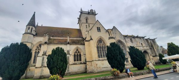 Je parviens enfin à a belle église blanche, Notre Dame, fondée au XI ème siècle. La façade a un fronton pointu accompagné de deux clochers aux ouvertures gothiques. A l’intérieur, de beaux vitraux colorés et les ex-voto des marins. Il y a même une barque de pêcheur toute entière. Au-dessus du porche, un historien, Arcisse de Caumont(1801-1873) a fait graver le nom des 475 compagnons de Guillaume le Conquérant.