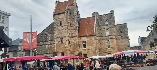 Les maraichers et vendeurs de fruits et légumes aux étals colorés sont sur la place devant la Lieutenance, (1695) belle maison en pierre de Caen appelé aussi Manoir de Bois Hibou. Les poissonniers sont installés dans une halle de bois, ouverte, installée sur une estrade. Plus lion, des vêtements bradés. C’est le dernier marché de l’été ; dit une marchande qui propose des bracelets en acier à 10 €. Toujours pour 10€ j’achète un Laguiole(peut être pas tout à fait authentique) mais j’i une fâcheuse tendance à égarer mes canifs.