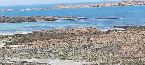 Nous avions prévu de piqueniquer aux Grandes Rocquesmais un mur d’escalade a été installé pour des scolaires et le parking est occupé. Nous terminerons notre journée balnéaire à la plage de Vazon. Malheureusement à marée basse la baignade n’est pas possible. La mer s’est retirée vraiment loin.