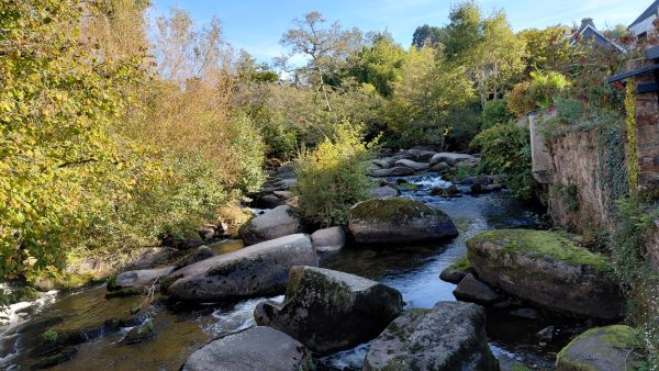 Plus haut, dans le centre du village après le pont, la rivière ressemble plutôt à un torrent de montagne au vif courant et à l’eau claire bondissant sur les rochers arrondis d’un chaos granitique. La Promenade Xavier Grall remonte l’Aven ; elle se déroule sur du sable fin entre des massifs fleuris. Des passerelles conduisent aux terrasses des restaurants.