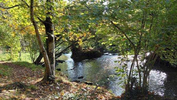 la promenade du Bois d’Amour continue à remonter le cours de la rivière, assagie maintenant, son lit élargi s’écoulant sous de très grands arbres. C’est dans le Bois D’Amour que Gauguin délivra sa leçon de peinture qui guida Sérusier pour peindre le Talisman.
