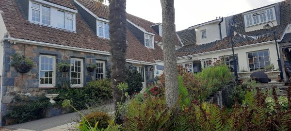 Pas de mesures-barrières ! Jackie nous fait la bise comme au temps d’avant-Covid. Nous suivons sa voiture dans les rues en pente de Saint-Pierre-Port. Architecture britannique, fenêtres à petits carreaux, bow-windows, nous sommes bien dépaysées. Le drapeau qui flotte n’est pas l’Union Jack mais la croix rouge de Saint Georges surmontée d’une croix dorée et pattée de Guillaume le Conquérant qui a été ajoutée récemment (1985). Guernesey, sous l’autorité de la Couronne Britannique ne fait partie ni du Royaume Uni, ni du Commonwealth, c’est un baillage qui a un statu particulier et qui est très fier de cette particularité. Les Iles Anglo-Normandes sont le reliquat de l’ancien Royaume de Normandie après que Philippe Auguste ait rattaché la Normandie au royaume de France en 1204. Boites aux lettres et cabines téléphoniques (il en reste en fonction) ne sont pas rouges comme en Angleterre.