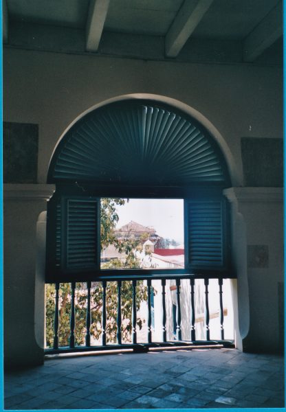 Le Musée de l’Architectureest moins prisé des touristes en car. La gardienne qui nous sert de guide, plus intelligente que la précédente . La visite est donc beaucoup plus plaisante. Cette belle maison coloniale est bâtie sur un plan similaire à la nôtre en beaucoup plus grand . La salle de réception immense : son plafond de cèdre est extrêmement décoré à l’espagnole, presque à la marocaine . Elle est flanquée de salles plus petites servant de chambres à coucher. A l’arrière, une galerie s’ouvre sur le patio . Dans cette pièce, les femmes brodaient, cousaient au frais . La vaste cour est bordée des chambres des domestiques d’un côté, de l’autre d’annexes utilitaires, cuisine extérieure, WC etc… Au fond, un petit édicule abrite une centrale à gaz (acétylène) pour l’éclairage . La citerne couverte se trouve dans un coin de la cour. L’eau de pluie est soigneusement captée par tout un système de gargouilles et de gouttières. Le sol est pavé de marbre importé d’Italie. Un détail architectural nous avait intriguées à La Havane : les demi-cercles au dessus des hautes portes de bois nous les retrouvons . ici, en fines lamelles de bois disposées en éventail pour l’aération.