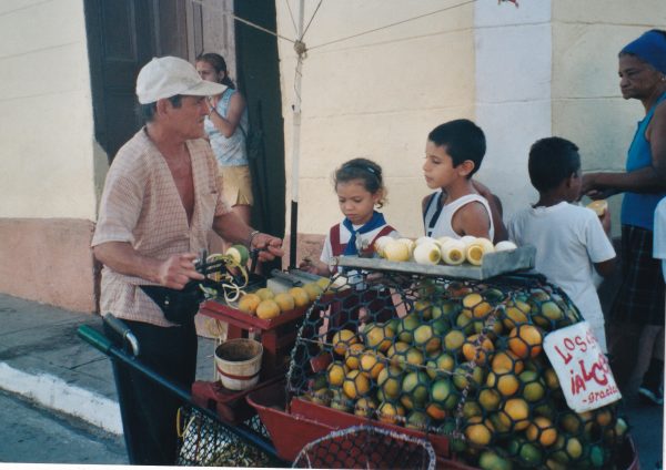 Les enfants des écoles vont en rang à la Foire du Livre. Ils sont réunis dans une salle pour assister à un spectacle . En route, ils mangent des glaces ou des oranges . Un homme pousse une petite charrette grillagée contenant des oranges. Avec une curieuse machine il les pèle, un fin ruban de zeste vert se déroule, puis il coupe l’orange par moitié. Je ne sais pas comment les enfants arrivent à manger sans se mettre du jus partout !