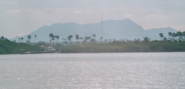 10 h nous embarquons sur un tout petit bateau comme ceux qui emmènent les touristes en plongée . C’est sans doute le même. Les valises sont entassées sur le pont, tout le monde s’assoit sur le rebord. La mer est grise, très calme, le trajet très court . Nous voyons la ligne de côte avec ses palmiers échevelés qui s’éloigne . Déjà on s’approche de la mangrove . On devine le sable blanc de la plage Le bateau accoste sur un ponton de bois dans les palétuviers .