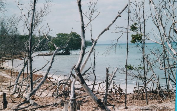 A l’extrémité de l’île, je découvre une domaine enchanté. Quelques arbres morts se détachent au contact de l’eau, puis des branches sèches forment un entrelacs que je contourne avec difficulté, m’enfonçant dans le tapis épais d’herbes marines desséchées, enroulées comme des copeaux, sans doute des Posidonies. Tantôt les racines aériennes des palétuviers pendent comme des lances menaçantes, tantôt elles ressortent de terre, pics argentés par le temps, polis par le sable, pièges à déjouer . Je suis prise dans un labyrinthe si loin de la civilisation . J’ai enfin l’impression de me trouver sur l’île déserte promise . Personne n’est passé sur ce sable . Pourquoi les palétuviers sont ils morts ? Les écorces se détachent laissant des traces de rouille autour des troncs . Partout des terriers de crabes qui fuient à mon approche et rentrent dans leur trou. Un arbre bien vert, à quelques mètres du rivage sur son radeau de racines aériennes entremêlées en arceaux complexes . Parti seul à la conquête de la mer, son feuillage dégagé forme une boule parfaite découpée net au niveau de l’eau .La langue de sable est si étroite, une dizaine de mètres à peine puis c’est la mangrove dense et verte avec des chenaux d’eau immobile limpide et verte. Je la rejoins avec peine, rusant avec les obstacles. Dans l ’eau peu profonde nagent de très petits poissons et des crevettes . Cette découverte m’enchante. Il me faudrait venir avec mon nouveau carnet moleskine dessiner l’arbre-radeau et les formes compliquées des squelettes des palétuviers ?