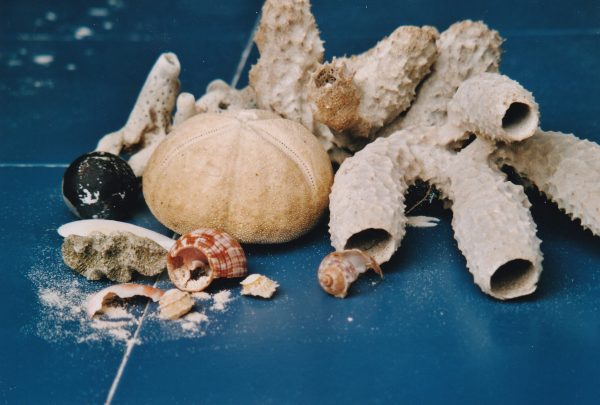 Je retourne en marchant dans l’eau, me jouant des obstacles et profitant de l’eau tiède. La marée montante a envahi le sable blanc, la plage a presque disparu sous les accumulations de copeaux de feuilles et sous les tas d’algues . Je rentre les mains chargées de trésors : test d’oursin énorme et deux éponges .
