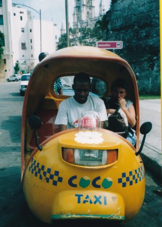 Nous rentrons au Vedado en Coco taxi– version latine du touktouk asiatique – version moderne aussi : une coque en fibre de verre jaune : un engin léger, rigolo, confortable mais terriblement bruyant. Le notre ne démarre pas, il doit être poussé par trois vigoureux passants . A chaque carrefour, il pétarade sans trêve . Malheur, s’il cale, il ne pourra pas repartir .