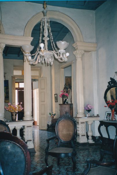 Avant le retour à La Havane, il est temps de décrire notre maison coloniale . Elle est située 126 calle Cienfuegos sur la route principale qui va de Cienfuegos à Sancti Spiritu. Ce nom est une coïncidence. Camillo Cienfuegos fut le compagnon de Che Guevara. La façade est peinte en vert amande. Elle s’ouvre par une très haute porte de bois marron antique. La fenêtre est grillagée avec des motifs en rosace évoquant un soleil et ses rayons. On entre par une pièce toute en longueur qui sert de bureau avec des bibliothèques remplies de livres. Le salon est très vaste, carrelé de motifs floraux imitant un tapis. Un portique de quatre colonnes sépare la pièce en deux, deux colonnes de chaque côté et deux au milieu. Quatre fauteuils cannés en bois foncé meublent chaque partie . A l’arrière, un piano . La chaîne Hifi et la télévision sont les seules concessions à l’époque moderne. A l’arrière du salon, une longue galerie couverte communique avec le salon par trois ouvertures dont l’une est fermée par une grille représentant le soleil comme celle de l’extérieur. Des persiennes de bois marron avec des lattes orientable ferment la maison.