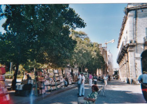 Une foule dense occupe maintenant Obispo, des échoppes de sandwiches sont ouvertes (pour nous c’est trop tôt). Les boutiques ouvertes semblent plus avenantes. Je commence à photographier les façades peintes. Sur une placette fleurie des oiseleurs vendent des oiseaux dans des cages. Les bouquinistes ont installé leurs étals sur la Place d’Armes. Tous ces livres me fascinent : œuvres de Lénine, de Che Guevara en bonne place ainsi que Garcia Marquez ; Il y a aussi de vieilles éditions avec de belles reliures. Un marchand très jeune, style étudiant me montre un traité de Charcot sur les maladies cérébrales. De nombreux fascicules sur la Flore et la Faune de Cuba me tentent.