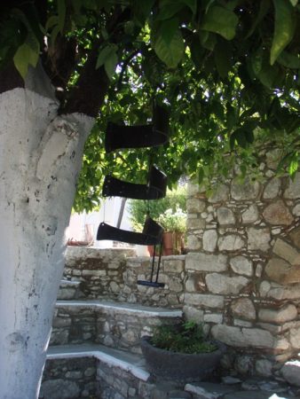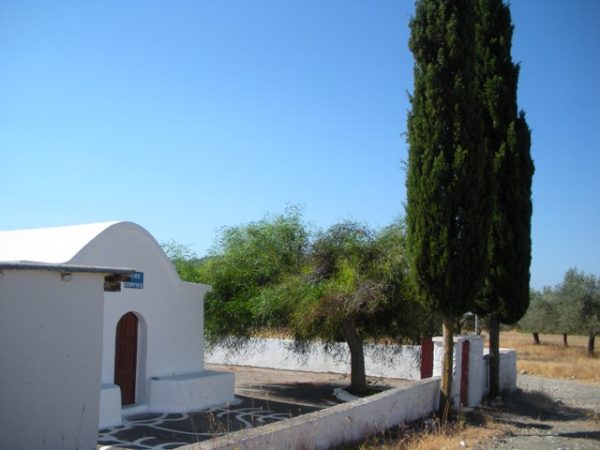 A la recherche de Aghios Giorgos, nous quittons la route asphaltée pour une piste . La campagne est très soignée, équipée de robinets et de tuyaux d’irrigation. De nombreux chemins de terre sillonnent la campagne. Lequel choisir ? La petite église chaulée se voit de loin avec ses deux hauts cyprès. La campagne bruisse des stridulations des cigales. On pousse la grille pour entrer dans une jolie cour barbouillée à la chaux de décorations florales. Chapelle hémicylindrique, toute simple.