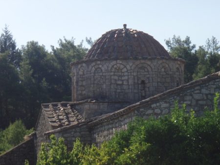 A Gennadi, nous complétons notre collection de chapelles : saint Raphaël, petite église toute neuve avec un toit de tuiles et un clocher évidé en arceau, entourée par une végétation luxuriante : quatre cyprès et des pots de fleurs. Surprise l’église est toute peinte à fresques – un peu neuves mais dans le style traditionnel.