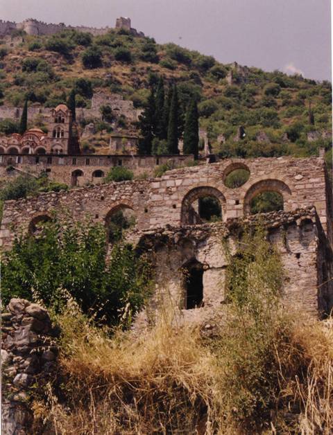 Au premier plan: palais du Despote, 2ème plan monastère de Pantanassa, sur la crête le château des Villehardouin