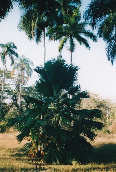 Dominique n’est pas enthousiaste pour prendre des stoppeurs. Moi, au contraire, j’y vois plus d’un avantage : rencontrer des Cubains ordinaires, parler espagnol, avoir des explications sur les cultures et bien sûr, un guide pour la route. Malheureusement, notre passagère ne fait rien de tout cela . Elle agace prodigieusement Dominique qui se méfie d’elle et ne pense qu’à s’en débarrasser. Nous traversons des villages et des rizières . Un nuage menaçant surgit brusquement . A peine l’avons nous remarqué, qu’une pluie diluvienne s’abat . L’essuie-glace de droite est défectueux : le caoutchouc est déchiré (pourtant nous avions bien été prévenues par Mireille et Hamdane) La route est devenue très glissante . Dominique maîtrise mal la direction . Heureusement, le beau temps revient aussi vite que la pluie était venue. Nous évitons Cienfuegos pour arriver plus vite au Jardin Botanique.