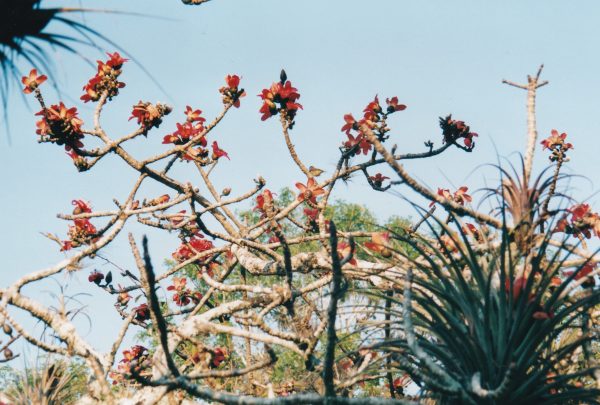 Cette découverte me ravit presque autant que mon premier baobab . De l’infiniment grand à l’infiniment petit ! Le colibri butine les grosses fleurs oranges comme le ferait un insecte . Son long bec recourbé fait penser à la trompe d’un papillon . Ses ailes battent si vite quand il fait du surplace qu’on ne les voit plus . Il fait le même bruit qu’un bourdon . Tellement rapide que je ne pense même pas à le photographier . Dominique s’y essaie avec méthode : attendre . Puisqu’il aime ces fleurs il reviendra sûrement . J’admire les couleurs métalliques de son plumage vert ou bleu , pensant au problème d’optique de Françon à la fac avec les interférences . Il faudra le chercher dans les photos . Ensuite, je privilégie la recherche d’autres arbres fleuris espérant revoir d’autres colibris. Un arbre aux fleurs rouges est aussi peuplé d’autres oiseaux, Dominique applique sa nouvelle méthode de chasse photographique .