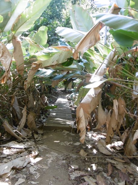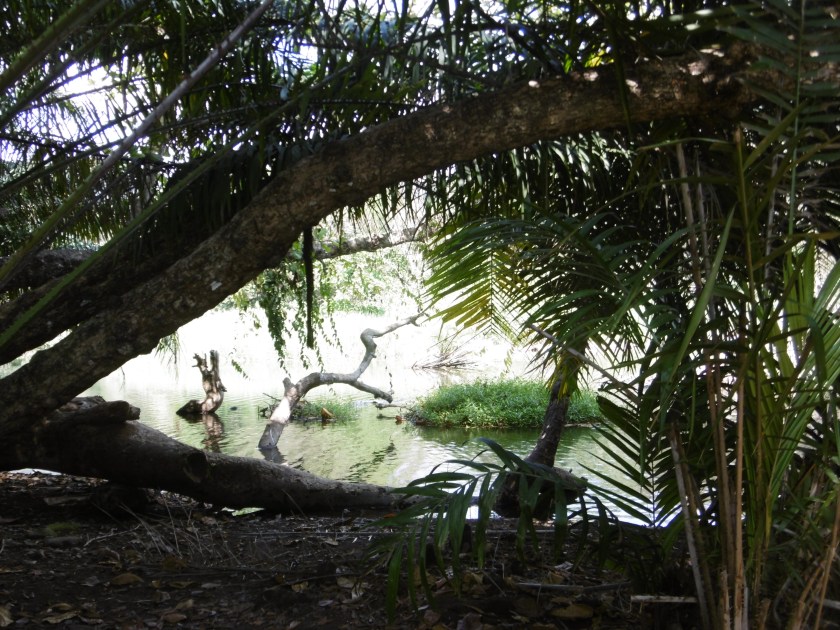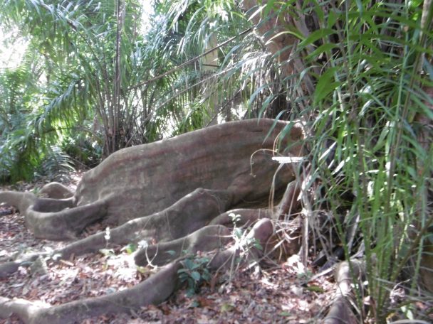 Je me promène avec une impression de sécurité sur les sentiers balayés ; les bêtes dangereuses se cachent peut-être dans les broussailles, peu de chances qu’elles en sortent. Ficus et palmiers font une ombre assez dense pour garantir la pénombre. Pénombre bruyante : cigales et oiseaux se font concurrence dans les « bruits de la jungle ».