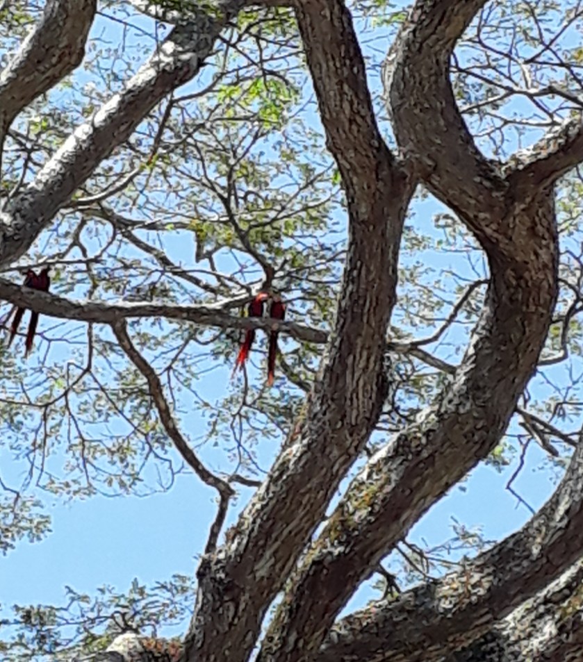 Deux petits perroquets verts sont perchés très haut. Il n’y en pas de rouge ici. Il y a des toucans mais pas ce matin. Ils sont occupés ailleurs. En revanche un pic à tête rouge a creusé son nid. Une tourterelle a le même chant agaçant que les tourterelles européennes mais elle est plus petite et a un bien plus beau plumage.