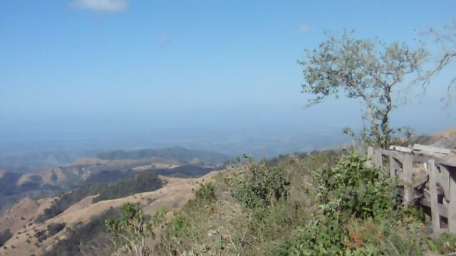 Après l’averse, nous traversons Monteverde et Santa Elena sur la route goudronnée. Au bout du village c’est la piste, bien entretenue et très fréquentée. Dès la sortie de Monteverde, nous découvrons le Pacifique enserré dans la baie étroite de la Péninsule de Nicoya. Le versant Ouest contraste avec la verte forêt. Peu ou pas de grands arbres, une végétation de pelouse sèche et rase. Quelques maisons dans les creux. La piste est creusée dans le tuf gris clair. Quelques gros blocs sont inclus. Quel volcan a craché de tels amas de cendres ?
