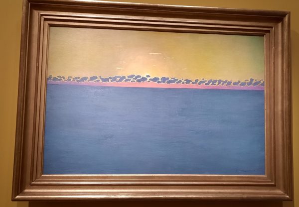 j’ai beaucoup aimé les deux Vallotton : un Coucher de soleil orange sur Honfleur très spectaculaire et presque abstrait Le coucher de soleil à marée haute, gris bleu