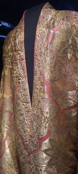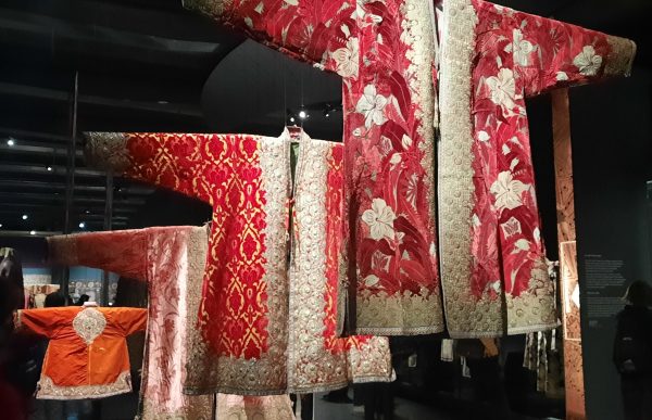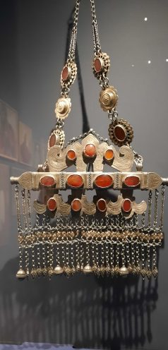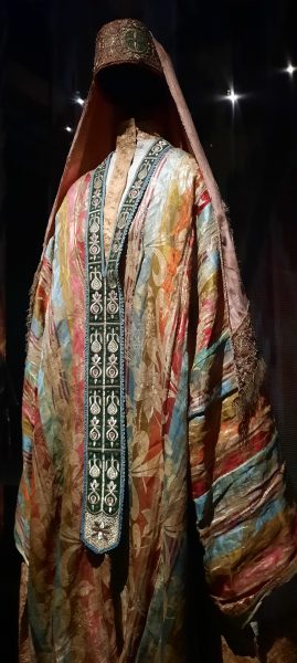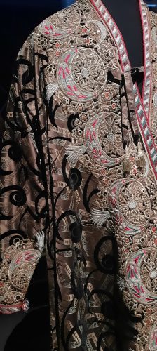 Dès l’entrée nous sommes accueillis par les dorures des tenues d’apparat des émirs de Boukhara : Shah Murad (1785-1800), Mohammad Alim Khan, Nasrulla Khan et du dernier Mohammad Amir Khan (1911-1920). Le titre de la section est : Pouvoir et Apparat. les Chapans étaient de lourds manteaux de tissus précieux, velours, brocard, soie, rebrodés d’or et incrustés de pierreries. la sériciculture fut rétablie en Ouzbekistan au 8ème siècle et les brodeurs travaillaient dans l’atelier de la citadelle d’Ark de Boukhara. La Broderie était un art exclusivement masculin, on disait que l’or se ternit des mains et du souffle d’une femme.