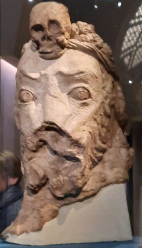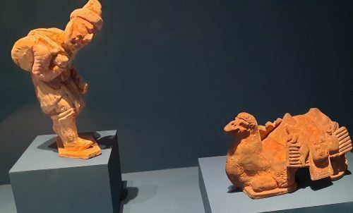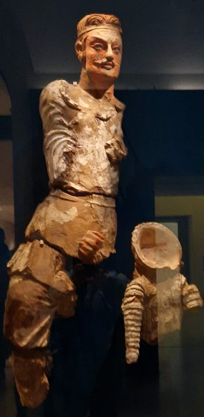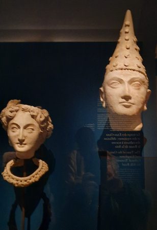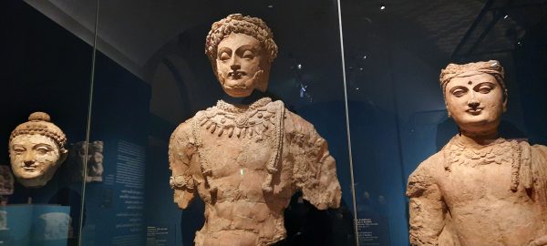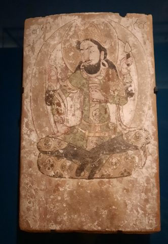 j’ai déjà croisé les Kouchans dans l’exposition Tadjikistan à Guimet l’an dernier. Ce guerrier avec son ruban retenant les cheveux, a un sourire ironique, presque un rictus, à côté de l’armure kataphractaire, symbole de la victoire sur les cavaliers des steppes, contraste avec la douceur des statues bouddhiques et du prince coiffé d’un chapeau pointu. Sculptures d’argiles recouvertes de plâtre d’une grande finesse.