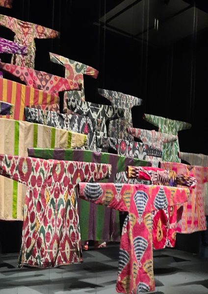 L’exposition se termine par un feu d’artifice coloré : le travail de la soie (vidéo passionnante) et installation des Ikats soieries teintes.  Ikat est un mot indonésien voulant dire « attacher » ou « nouer » En Ouzbekistan o n nomme Abrbandi et c’est un des symboles de l’identité ouzbèke. la teinture est réalisée quand le fil de trame est installé sur le métier. On procède à des ligatures de plusieurs fils. La teinture qui en résulte est un peu floue, « nuageuse »
