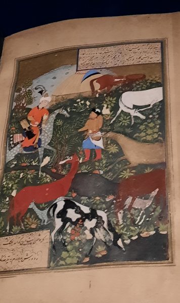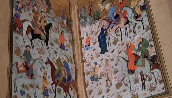 Dans des vitrines, des manuscrits, encre sur papier, en divers écritures, en sogdien (cycle de Rostam), persan, judéo-persan(lettres hébraïques). la porte Samarcande a pour décor la Déesse Nana héritière d’Ishtar avec sa suite d’orants et de processions.