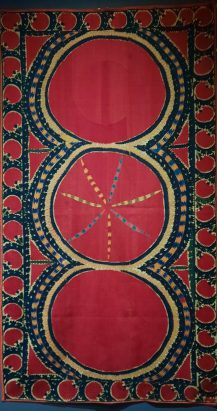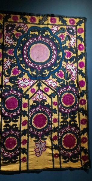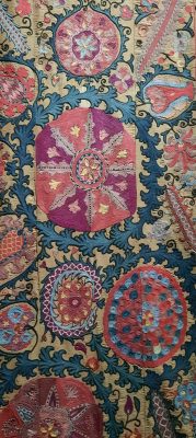Nous entrons alors dans l’univers des femmes, dans le domaine de la maison avec les Suzanis qui sont de grands panneaux décoratifs brodés à l’aiguille par les femmes réalisés au sein du foyer