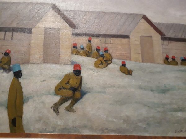 Un couloir sombre traite de la Grande Guerre avec des images filmées de masques- à gaz et gueules cassées, mais aussi l’affiche de la mobilisation des tirailleurs sénégalais qui avec l’arrivée en 1917 des afro-américains généralise le contact avec l’art africain. Dans les tranchées, les soldats africains sculptent des cannes ou autre chose. Une vitrine expose ces productions.