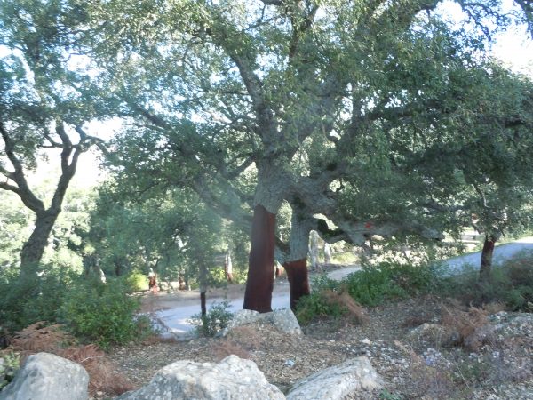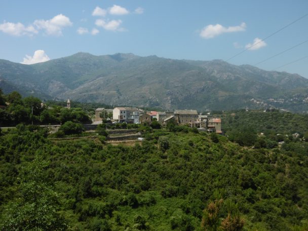 La très étroite et très tortueuse D62 relie les villages de Rapale , Pieve, Sorio et S Pietro-di-Tenda. A l’heure du déjeuner il y a peu de circulation et c’est heureux parce que les croisements seraient hasardeux. Le plus souvent nous sommes à l’ombre de beaux arbres : chênes de taille impressionnante, parfois des frênes et des châtaigniers en pleine floraison. Quand on sort de la forêt, les genêts à balai égaient la route, très hauts, et très jaunes, et toujours des cistes. Les oliviers sont anciens, très hauts mais leur ombre est moins dense et moins fraîche.