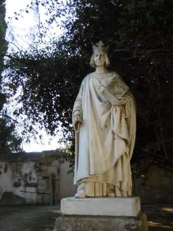 Nous traversons le village ombragé par de grands platanes. Comme à l’accoutumée, parking impossible, on gare la voiture à quelques centaines de mètres après la sortie du village. Un homme qui promenait ses chiens de chasse m’indique un raidillon qui conduit à l’église – campanile très haut, fronton baroque – elle ne retient pas mon attention. Les trois statues-menhir sont protégées sous un petit édicule vitré. Comme à Patrimonio, elles ne sont guère mises en valeur. La ressemblance avec une silhouette humaine n’est pas évidente.