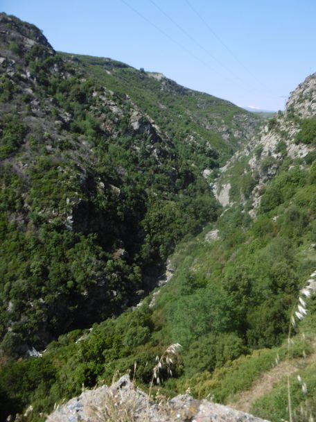 La D62 croise la T11 à Biguglia. Après avoir traversé des quartiers résidentiels la petite route passe sous de très beaux chênes-liège puis s’élève entre les buissons de cistes. Clin d’œil à Humboldt, les cistes, fanés au niveau de la mer, ont une floraison blanche merveilleuse. Le Bevinco qui a creusé les gorges coule nettement en dessous de la route, on ne le devine même pas sauf à la fin avec une cascade. Je marche le long du parapet pour une promenade pittoresque. Sur une plateforme, un écriteau signale d’anciennes galeries de mines de cuivre d’un complexe comprenant 3 galeries sous la route abritant 5 espèces de chauve-souris protégées : 10 gites de transit du Minioptère de Schreibers et 7 gites de Rhinolophe Euryali . Après plus d’un an de Covid on n’a pas envie de fréquenter les mines abandonnées aux chiroptères. Les falaises servent également d’habitat à nombreux oiseaux. Une ZNIEFF protège ces habitats et ces populations. Plus on monte et plus le site devient spectaculaire. Les roches affleurent. Un site d’escalade est aménagé avec cordes et pitons.