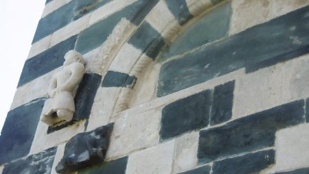 La Canonica est fermée, déserte mais extrêmement belle avec ses pierres claires polies de calcaire cipolin et « une subtile polychromie allant du gris jaune au vert clair » selon le Guide Vert. Harmonie des volumes, sobriété des décors : quelques frises, les entrelacs du linteau, six claveaux figurant des animaux ou des personnages naïfs. Ma plus belle surprise, du côté de l’abside, mon attention a été attirée par le piaillement des petits fauconneaux excités par le retour des parents. L’oiseau adulte ne se montre pas tant que je reste proche du nid installé dans un trou de bouline. En prenant du recul, je constate que toutes ces cavités sont occupées par des oiseaux.