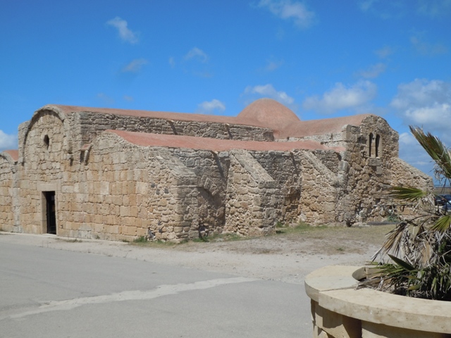 Au bas de la colline, près du village composé d’une seule rue de maisons mitoyennes basses, se trouve la très belle église de San Giovanni di Sinis. Avec sa coupole rose, son toit légèrement arrondi, elle ressemble plus à une basilique byzantine qu’à une église romane italienne. Volumes tout en courbes, façade de pierres nues percées seulement d’arcades à l’arrière. Elle est très ancienne. Commencée au 6ème siècle, 10 ou 11ème. A l’intérieur, calme et fraîcheur, des arcades romanes séparent trois nefs verdies par l’humidité. L’autel est fleuri d’agapanthes bleues. Le bénitier est une très belle vasque de pierre.