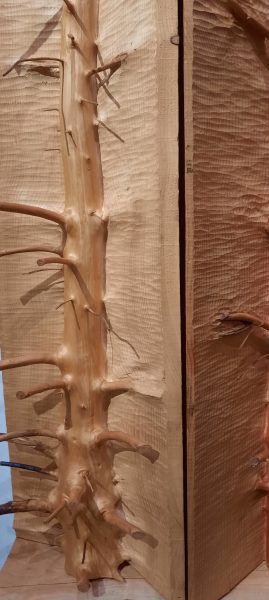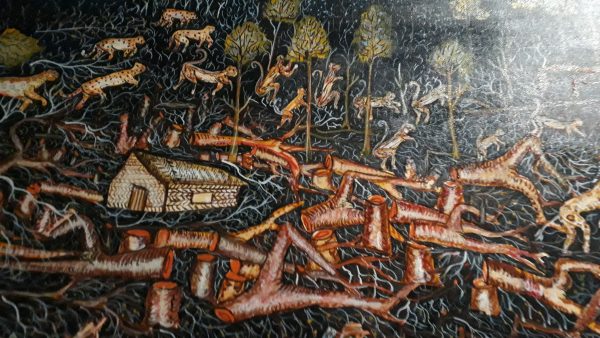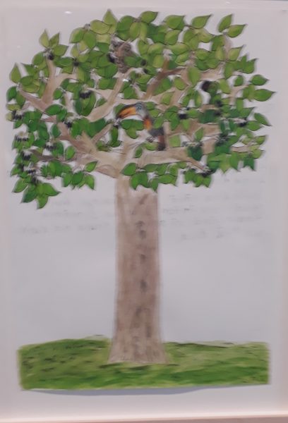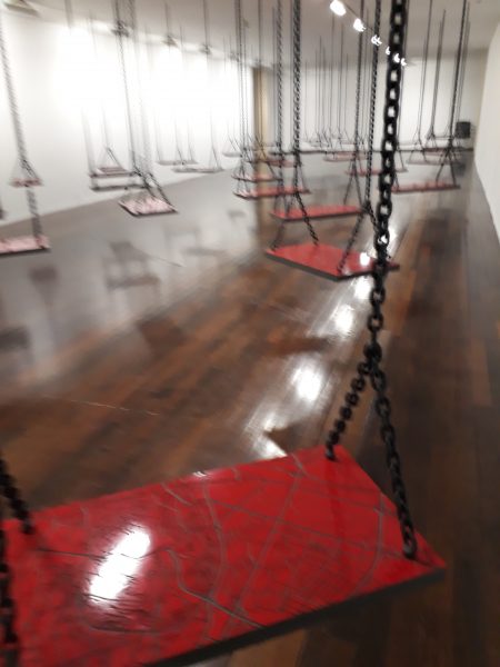Elle utilise le papier mâché le papier plié coloré et vernis. parfois ses compositions sont de grande taille. Je n’ai pas trop aimé ses grandes femmes blafardes soulignées de noir. Elle réunit animaux et personnages : sa forêt en papier plié présente des dizaines d’oiseaux, papillons, personnages suspendus à des fils. Elle a inspiré les enfants des écoles qui ont réalisé leur forêt que j’avoue préférer à celle de l’artiste chevronnée, plus colorée.