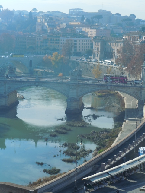 Un escalier raide passe sous une arche .Du couloir circulaire, la vue sur le Tibre et sur Rome est surprenante. Nous prenons photo sur photo, des ponts sur le Tibre et de la coupole de Saint Pierre.
