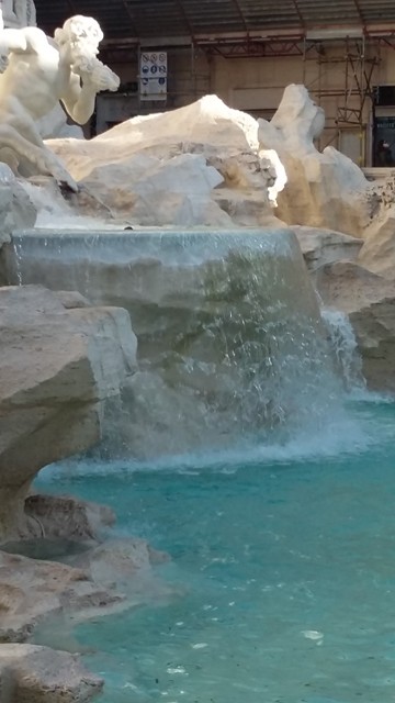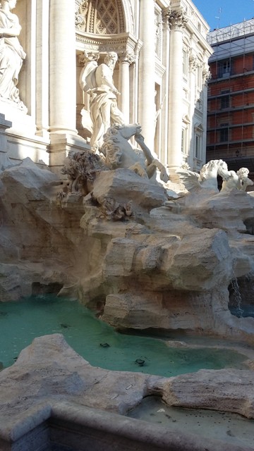 En se levant tôt, nous pensions trouver la Fontaine de Trevi pour nous seules (autobus 23 – tram n°8 – P Venezia bus 80 à). Erreur ! Les Chinois et Japonais s’y sont donné rendez-vous. La fontaine a été nettoyée il y a peu, elle est très blanche, l’eau est très bleue. Mais elle est dans l’ombre. Le must, c’est le selfie. On photographie ceux qui n’ont pas acheté la fameuse perche qui éborgne les autres. Le tourisme le plus hideux a envahi les petites rues des alentours. Un peu plus loin, c’est calme, il y a même un petit marché de légumes.