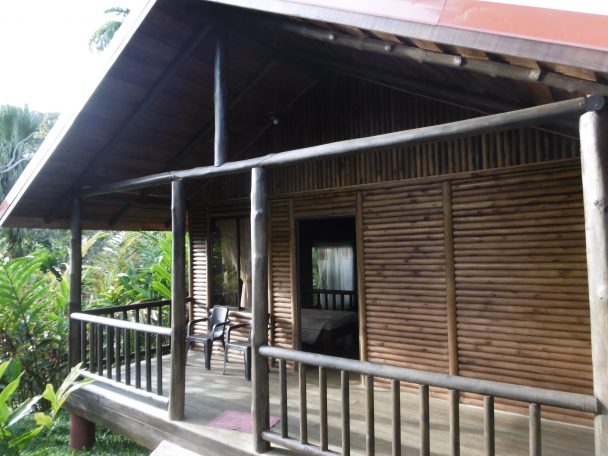 Pedacito de Cielo est un hôtel bien établi : les certificats affichés datent de 2009. Il possède une vingtaine de chalets de bois avec vue sur la rivière San Carlos ou sur le jardin fleuri. Marcos nous accueille et nous remet la clé du N°26 accessible par une rampe de ciment. Il nous invite à un pot d’accueil. Le bungalow est construit en rondins très réguliers. Il est très haut de plafond à deux pans en larges planches de beau bois foncé. Deux niveaux : au niveau supérieur, un lit une personne, une table contemporaine posée sur un tronc et la salle d’eau. Trois marches plus bas, une grande pièce avec un grand lit, une coiffeuse. Sur quatre côtés on a percé de larges baies voilées de rideaux fins blancs brodés de fleurs dorées. Un ventilateur à longues pales donne de la fraîcheur. Il manque quand même une armoire : les vêtements resteront dans la valise. Pareil dans la salle de bains, rien pour poser le verre à dent ou le savon.