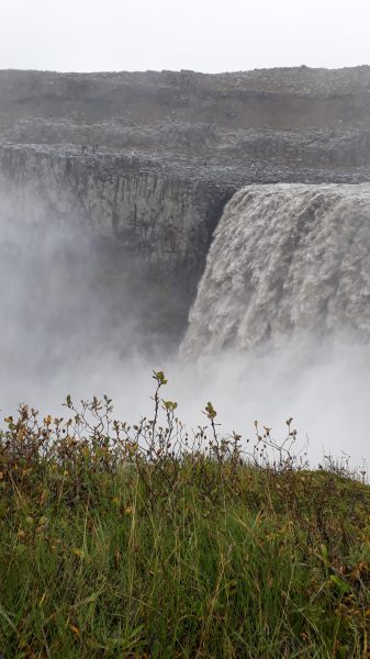 C’est la source chaude la plus puissante d’Islande (débit 180 L/sec) qui alimente le chauffage de la région et les serres. Elle sort de roches rougies dont la couleur contraste avec le tapis de mousses vertes qui la surplombe. La vapeur se répand sous les gouttes d’une pluie bien fraîche et elle ne suffit pas à nous réchauffer. Un spa luxueux est construit à proximité.