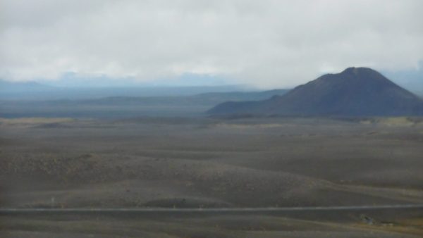 100 km sur la route circulaire qui monte sur un plateau venteux où les rafales se déchaînent : un voyant s’allume dans la voiture : 3° C risque de verglas ! La neige couvre les sommets. Les nuages s’accumulent. Quand nous passons devant le cône imposant d’un volcan, la pluie se met à tomber dru. Impossible de sortir pour consulter les panneaux. Le volcan restera non identifié.