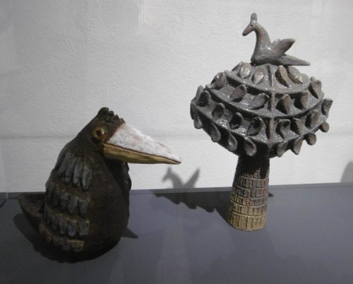 Au premier étage le musée des Céramique expose des céramiques contemporaines . Certaines sont très colorées, violentes, d’autres blanches avec de curieuses protubérances comme celles des Radi avec coupes et boudins, d’autres jouent avec les contrastes entre la surface vernissée et celle brute. j’ai beaucoup aimé les insectes et les argonautes de Frédérique Bourguet.