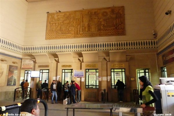 Arrivée à la gare vers 8h. Un porteur se propose pour les valises et nous conduit au bout du quai devant l’emplacement où la voiture 1 s’arrêtera. L’horaire du train est flou. Sur le ticket imprimé 8h38, mais tous les cheminots parlent du « train de 9h » en provenance d’Assouan. Il est donc « à l’heure » à 9h. Les premières sont très confortables, fauteuils »avion » de business class, rembourrés, inclinables, repose-pied et beaucoup de place pour les jambes