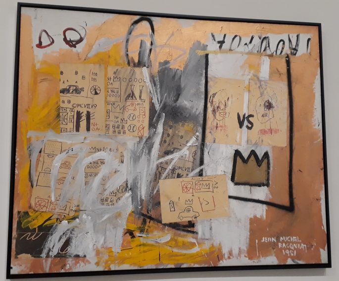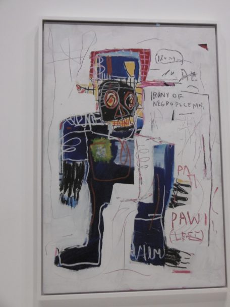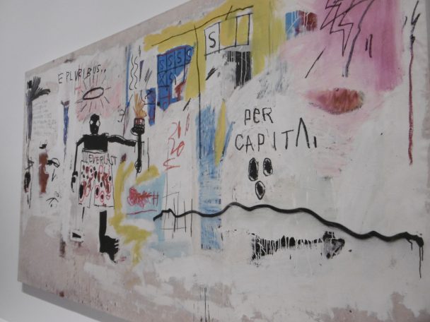 Dans ce tableau « per capita’ on reconnait le boxeur à son short, l’auréole, « ex pluribus… » est le début de la devise américaine mais il manque « unum » l’unité, les noirs, la diversité ne seraient ils pas compris dans ce « pluribus« . Per capit& par tête introduit la lise de revenu brut par habitant selon les Etats des USA , on voit la différence entre les états peuplés de nombreux noirs, ce tableau dénonce la spéculation initiée par Reagan qui augmente la pauvreté et les inégalités. Dans un quadrillage des S peuvent symbolise Sugar ou Sacks(de coton) et les échanges commerciaux. La torche peut être celle de la Statue de la Liberté que voient les immigrants en arrivant à New York, elle peut aussi être la torche olympique de Jesse Owens, premier sportif noir médaillé olympique. Quelle richesse dans le contenu de cette toile. Et nous aurions pu passer sans rien voir d’autre que des graffitis ou des couleurs sans l’intervention du médiateur!
