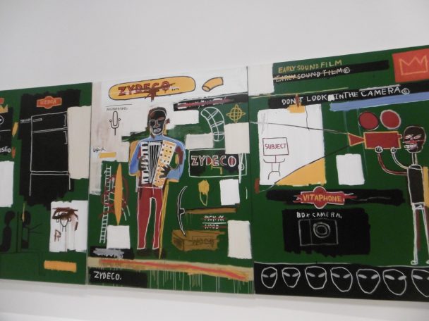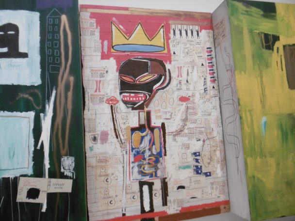 Encore un triptyque, retable, en plus des symboles chrétiens, on voit des masques africains et Ogun le dieu Yoruba qui est aussi vénéré dans le vaudou d’Haïti (le père de Basquiat était haïtien), on voit aussi des motifs avec les bras en l’air courants en Afrique de l’Ouest et toujours des graffitis qu’il faudrait prendre le temps de lire et de déchiffrer.